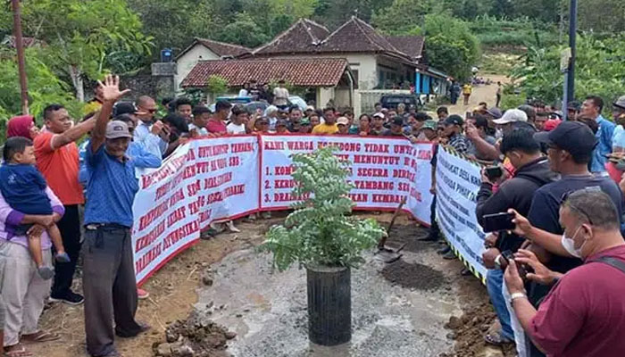 Seratusan warga menggelar aksi dengan memasang patok di jalan desa di perbatasan Klaten-Gunungkidul, Gantiwarno, Klaten, Jumat (2/2/2024).