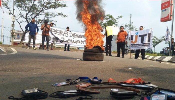 Beritainternusa.com,Banten – Sejumlah jurnalis yang tergabung dalam organisasi pers melakukan gelar aksi unjuk rasa di depan kantor DPRD Banten, Kamis (30/5/2024).