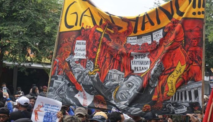 Spanduk ini bergambar karakter menyerupai Presiden Joko Widodo yang diseret keluar istana. Ada tulisan-tulisan lain di spanduk tersebut, seperti ‘Hilirisasi berkedok solusi’, ‘Stop Kriminalisasi Petani’ dan ‘Daulat Rakyat’.